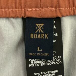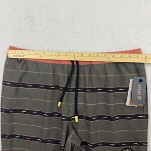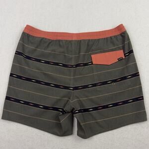 Dive into adventure with these Roark Shorey 16” Boardshorts, crafted from a premium recycled polyester, hemp, and elastane blend for durability, stretch, and comfort. These men’s size Large shorts feature a green and black striped design with orange waistband, drawstring closure, and a rear flap pocket for essentials. Quick-drying and sustainably made, they’re ideal for surf, swim, or everyday summer wear.