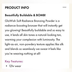 GloWish Soft Radiance Bronzing Powder is a radiance-boosting bronzer that will instantly get you glowing! Beautifully buildable and so easy to use, it lends all skin tones a natural-looking tan, warming your complexion with luminosity. The light-as-air, non-powdery texture applies like silk and blends so seamlessly we swear it feels like you’re wearing nothing at all!