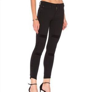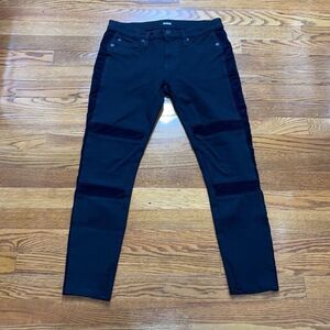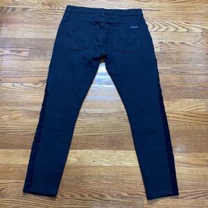 Black stretchy Ponte pants with a tuxedo stripe and leg details for a dressy, sophisticated look.