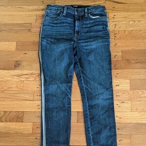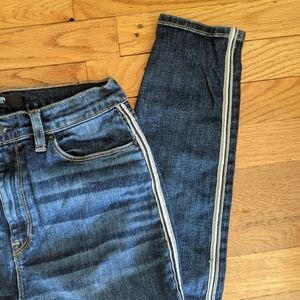 Medium wash denim, super skinny, Barbara style jeans with high waist and black and white stripe down each leg.