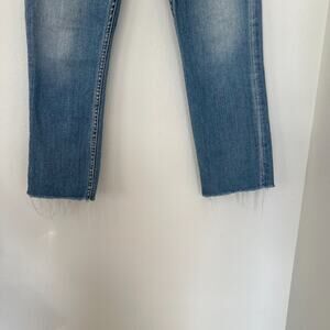 In good preowned condition. Flattering factory facings in the wash. Raw hems. Inseam is about 23.5" and the rise is about 9".