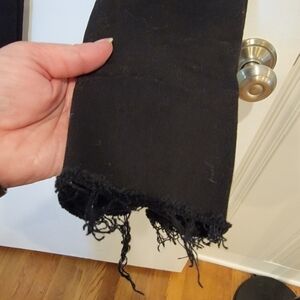 Black high rise skinny jeans with a sparkly silver stripe down the sides and raw hems.