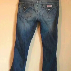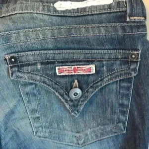 This pair of blue jeans. The buttons have the brand Hudson on them. The label on the right pocket has been worn off.