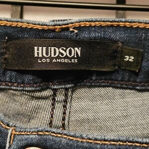 These Hudson Jeans feature a sleek skinny fit in a classic blue hue, perfect for a modern, stylish look. The denim showcases a slightly faded finish, adding a touch of character and a worn-in feel. Ideal for casual outings or a chic everyday ensemble.