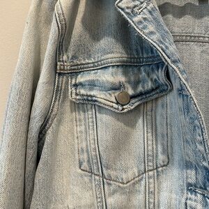 Features: long sleeve jean jacket, button up closure, side pockets, fraying and distressing throughout, light wash, light blue jeans