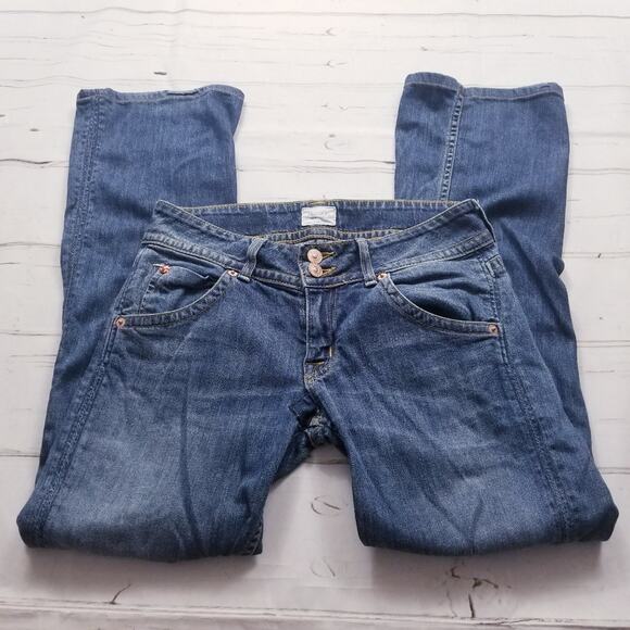 Hudson Jeans Distressed & Patched size 27. These jeans are super cute. They show some minor wear. There is a patched area in the crotch as shown in pictures. Plenty of life left. From a smoke free and pet free home.