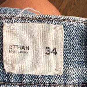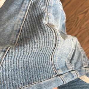 Light blue slim fit jeans with unique knee detailing. Perfect for a modern look.