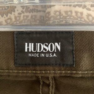 Olive green base with green neon stripe Hudson Jean, size 26. Lightly worn, no stains, pulling or discoloration. Perfect with a white tee for an on-trend look.