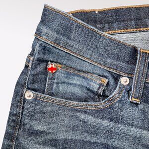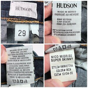 Clean dark wash stretch denim with Hudson’s signature V-back pockets and midrise fit. Soft, flattering, and still in great shape.