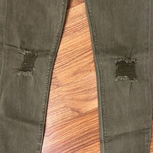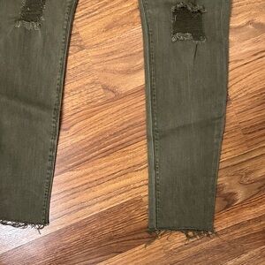 Chic olive skinny jeans with distressed details. Ideal for versatile styling.