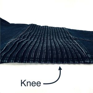 Style Description: Moto style, midrise, super skinny jeans | Zip fly with button closure | Slightly angled, vertical front zip faux pockets (functional zippers but no actual pocket behind them) | Rear patch pockets | Tonal stitching | Pleated biker knee detailing