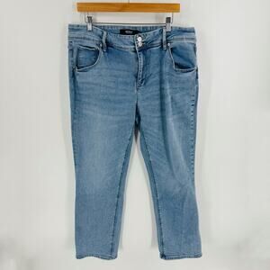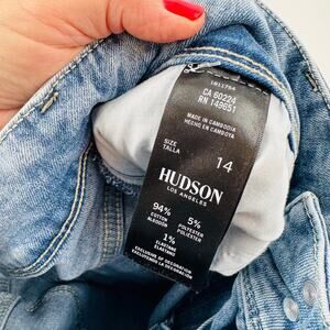 Hudson Jeans, women’s denim, size 14, light wash jeans, skinny jeans, stretch denim, mid rise, flap pockets, Union Jack pocket, classic denim, casual essentials, elevated basics, soft stretch, Y2K revival, high-quality denim