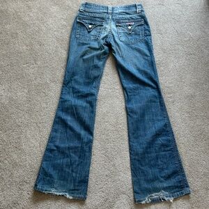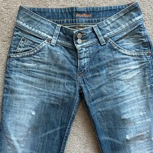 Wear on legs and bottom of jeans is purposeful due to the style at the time