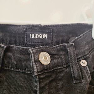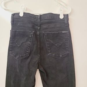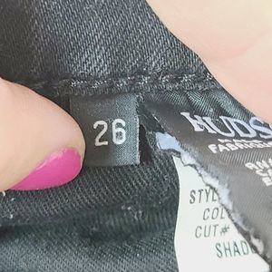 Hudson Zoeyy High Rise Ankle Straight Black Distressed Denim Jeans. Size 26. The front distressing has opened some, one knee is open. They are in good preowned condition, no stains.