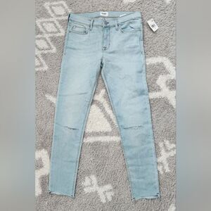 Hudson skinny jeans with a faded patina. 5-pocket styling. Single-button closure and zip fly.