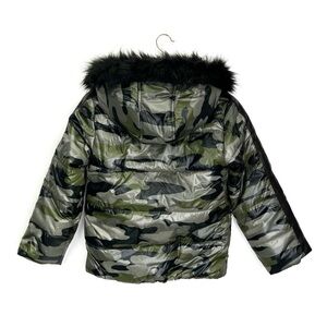 Style Description: Camo print hooded puffer jacket with faux fur trimmed hood | Zip front | Slip pockets on front waistline | Hemmed sleeves atop a ribbed knit cuff | Attach (non-detachable) hood | Micro fleece lined | Insulated