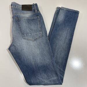 The Hudson Light Wash Mens Zack Slim Fit Distressed Jeans in size 31x34 are made of cotton denim. These light blue jeans feature a slim fit and a skinny style, making them a trendy and stylish choice for men. The distressed detailing adds a unique and edgy touch to the classic denim look. Made by the brand Hudson, these jeans are crafted in the United Arab Emirates, offering a high-quality and fashionable addition to any wardrobe.