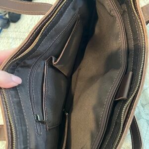 ROOMY CAPACITY: Can fit up to a 15" laptop PREMIUM LEATHER: Thick, firm, sturdy full grain buffalo leather INTERIOR: 2 compartments (1 velcro strap compartment for laptop, 1 open main compartment) Velcro strap laptop compartment has thick foam padding for laptop protection/support Main open compartment includes a zipper side pocket and two open side pockets/holders All compartments are lined to the base and closed No openings at the base of each compartment; items, such as coins or pens, will not slide into the next compartment