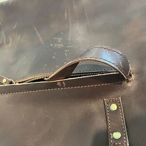 EXTERIOR: Top main zipper closure to close entire bag 1 outside front zipper pocket with leather flap cover 1 leather strap inside the front zipper pocket that attaches to suitcase and trolley handles Thick, firm, stiff, sturdy leather; not soft