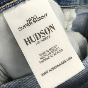 Sitting at a mid rise on the hips, these jeans by Hudson are cut in a form flattering skinny leg fit with destroyed knees for a fun look to pair with your favorite t-shirt. Zip fly, button closure. Belt loops. Classic 5 pocket styling. Skinny leg. Cropped for the ideal ankle length. Complete with knee destruction and vintage looking fading. Cotton. Machine wash. Color name is heart of glass. TDFHOG1MA407. In preowned condition.