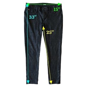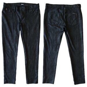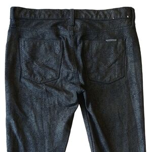 Good used condition, with no stains or tears. Comfortable and soft mid rise skinny jeans, with stretch. The black fabric has a coated crackled texture. Has 1 small functional front pocket, 2 back pockets, and a zip fly/button closure.