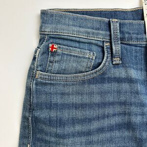 Hudson Denim Noa high rise straight leg jeans in a medium blue wash with flattering fading and whiskering at hips and thighs. Higher rise with straight legs, a raw hem, and a slight ankle length crop. Zip and button closure. Classic 5 pocket design, back Hudson logo, decorative Union Jack designs on studs. Women's size 26, measurements pictured. Excellent used condition.