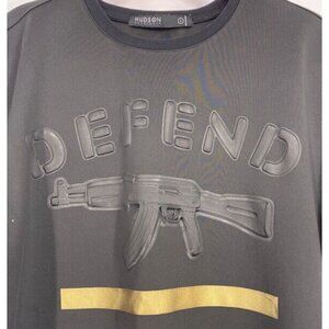Hudson Outerwear Defend ammo short sleeve top. 3D "Defend" and gun on center. Sleeves have printed ammo around the hem. Metallic gold stripe. 100% polyester. Size Large