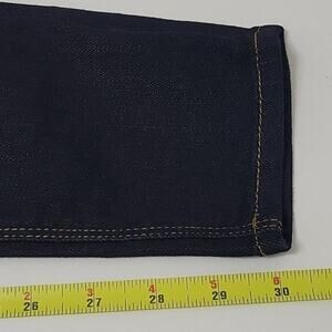 This article worn several times. still in top notch shape. colir is Che. dark rinse. Skinny leg button and zips for closure. 5 pocket style. comfy. midrise.