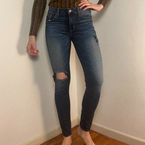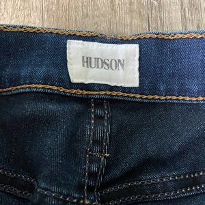 Hudson jeans, Size 28 in very good condition. Skinny, full length with one hole in the right knee and one smaller distressed opening at the top left hip area. The exposed areas sport a black fray material, making for an edgier and almost more romantic look. Working pockets in front and back and some distressed wash throughout the vibrant dark-medium blue.