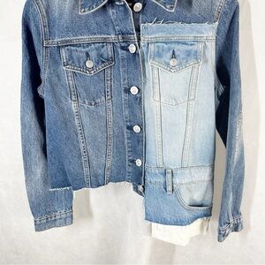 Hudson Spliced Denim Trucker Jacket in size Small. Measurements are approximates only. New with tag, no flaws. Raw and uneven hem, 2 shades of blue denim patched together, front pockets.