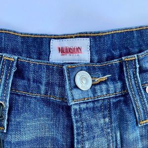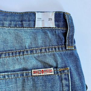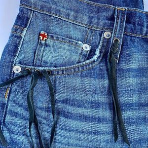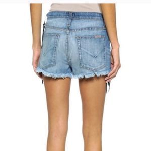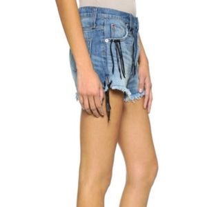 Denim fringe cutoffs. Jolie wash. Faded + Distressed details. Navy suede fringe detail. Trendy frayed/distressed cutoff hems. Button-front closure. Classic Pockets. 100% Cotton.