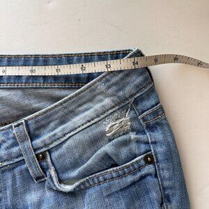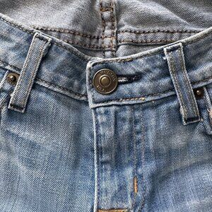 Distressed detail on back pockets, slight signs of wear near button closure.