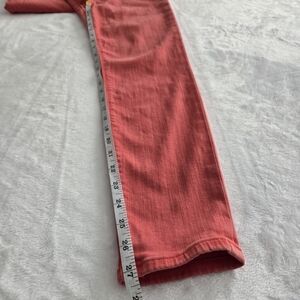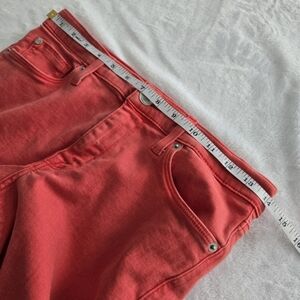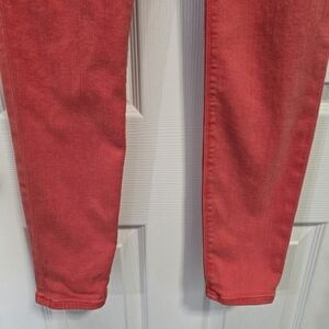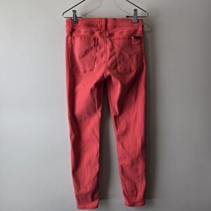 48% cotton, 45% lyocell, 5% elasterell polyester, 2% spandex. Does have some stretch to them. Skinny leg with a mid rise. 27" inseam. Normal signs of wear and wash. Color is called Carrot. Distressed red with orange undertones. Please allow for a slight color difference in person due to lighting and camera. Size 29. Ships fast & clean!!