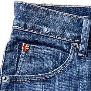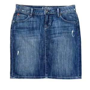 Hudson denim stretchy distress skirt 27 Like new Hudson distressed denim miniskirt. Nice medium-dark wash with just the right amount of fade. 5 pocket. Stretch. or size 4/6 equivalent. Waist 15.5". Length 18". Zipper fly/button closure. slit in the back.