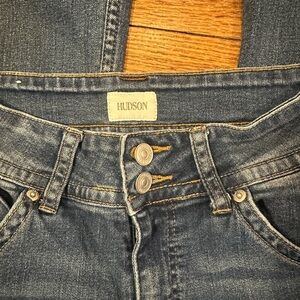 Hudson signature boot jeans with 8 3/4 rise, size 27, broken in and soft, natural hem with 33” inseam, broken in and soft, small blue mark on left knee.