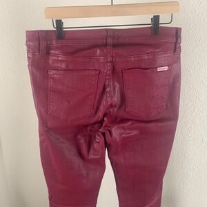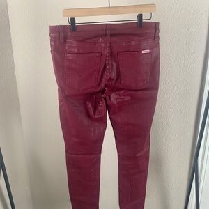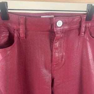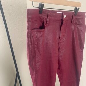 Upgrade your wardrobe with these stunning Hudson Natalie jeans. The burgundy red color and high shine make these skinny jeans a perfect choice for any occasion. The button closure and high-rise waist add a touch of elegance to the overall design. Made of a cotton blend denim fabric, these jeans are machine washable and easy to maintain. With a solid pattern and dark wash, these jeans are perfect for any season. The ankle length and pockets make these jeans practical and functional. Size 32 (but measures to a 34 inch waist). Excellent like-new condition.