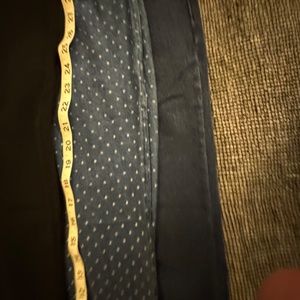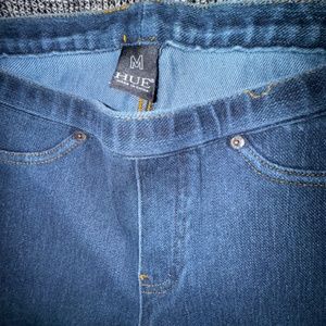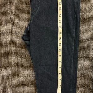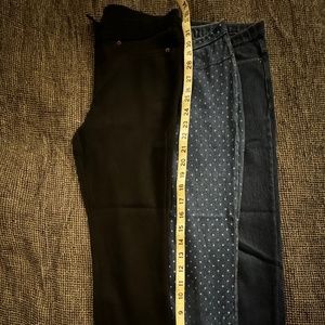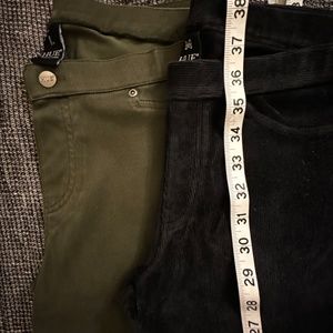 Original Hue leggings in stretchy, comfortable cotton/poly/spandex (75/21/4%, respectively) blend — for all-way stretch — size M denim leggings (jeggings). Five colors: black, blue with white dots, navy, olive green and black corduroy. These are straight/skinny leg, and conform to the length of the leg, with faux front pockets and functional back patch pockets. PRICE INCLUDES ALL FIVE PAIRS. Cute under a denim jacket and a tunic top with a pair of ankle boots or under a swing dress with a pair of sneakers or knee-hi boots.