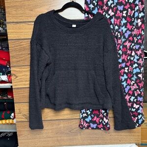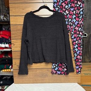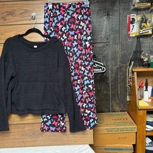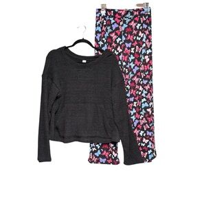 This pajama set features a solid black long-sleeve top paired with vibrant butterfly print pants, offering a stylish and comfortable sleepwear option. The soft knit fabric ensures a cozy fit, making it perfect for a restful night's sleep. NWT