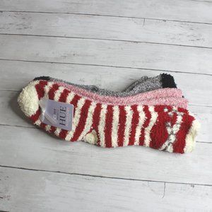 This pack includes three pairs of cozy slipper socks. They are thick, soft and fuzzy. One is red and cream stripe, one is black and gray and one is red and off white. They are brand new with tags.