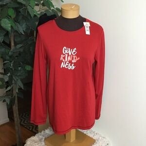 GIVE KINDNESS HUE lounge/ Sleep top with socks large NWT red with black trim white lettering and peachy/pink (word kind) sequins black socks approximate pit to pit 20 shoulder to hem 26