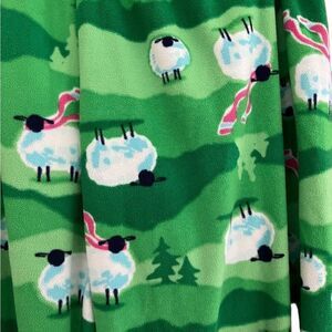 HUE 2 piece fleece pajama set, size M. Pink crew neck long sleeved top with green trim, pants have an elastic waistband. 100% polyester. Approximate measurements are pit to pit 20”, length from shoulder approximately 25, rounded hem. Green Pants waist 13”, stretchy, inseam 27”. Cute sheep print.