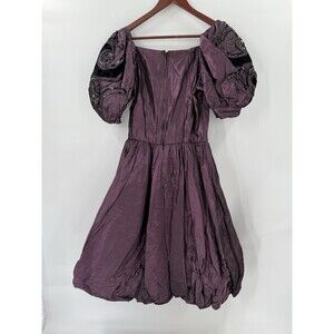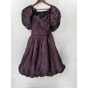 The Huey Waltzer for Darcy 80's Dark Plum Bubble Hem Sequin Puff Sleeve dress is a stylish and elegant choice for formal occasions like weddings or parties. This knee-length dress features a V-neckline, zip closure, and a fit and flare style with a bubble hem for added flair. Made from a woven fabric, this vintage-inspired dress is accented with sequins and puff sleeves, perfect for summer, fall, or spring events. The dark purple color adds a touch of sophistication, making it a standout choice for any woman's wardrobe.