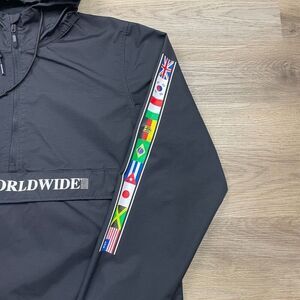 Huf Jacket Mens Large Black Anorak Skateboarding Worldwide Flags Hooded