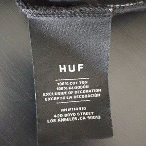 HUF brand t-shirt with H on front and HUF logo around neckline. Short sleeve. Skateboarding and Streetwear Brand. Mint condition with no defects.