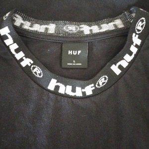 Huf black T-shirt with H on front and logo around neckline Sz L