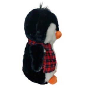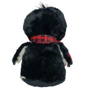 HugFun Christmas penguin plush stuffed animal with a black and white body and a red plaid scarf. Measures 13 inches.