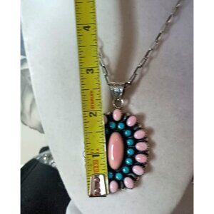 This stunning handmade medallion pendant necklace features a unique cluster design with sterling silver, pink conch, and snake eye turquoise stones.
