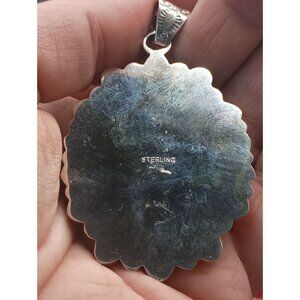 New. Pendant measures about 2" long 1 1/2" wide. Handmade chain is adjustable up to 12". Also has a large bale that can accommodate up to about a 7 mm thick chain or string of Navajo pearls. Weighs a whopping 36 grams.