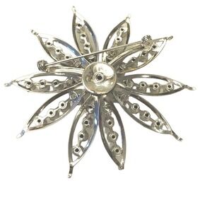 Enormous, pristine vintage 1950s brooch featuring prong-set clear white crystal rhinestones in a silver-tone metal. This mid- century modern three-dimensional openwork flower brooch is a striking piece and impeccably preserved. it is even more beautiful in person. Send me an offer, you will not regret it. It is stunning!