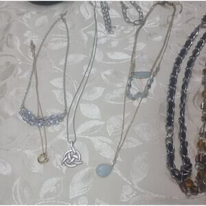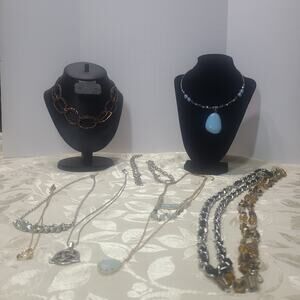 10 necklaces of varying sizes. All lengths, varied colors and all wearable . Please see pictures and message with any questions. Thank you!
